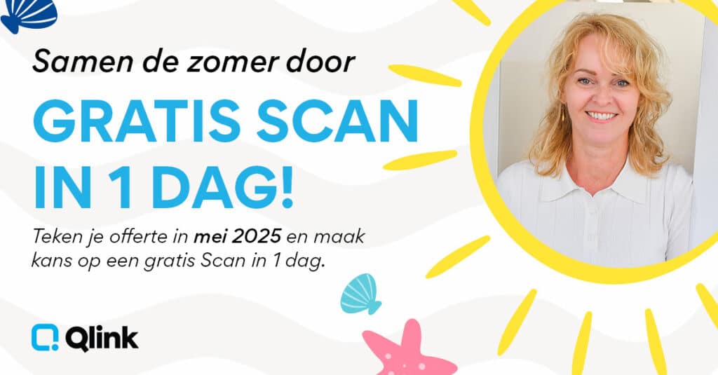 Teken je in mei 2025 je offerte bij Qlink? Dan maak je kans op een gratis ‘Scan in 1 dag’ voor jouw organisatie! Qlink biedt slimme software en digitale ondersteuning die jouw processen makkelijker en efficiënter maken. Ook in de zomer staan we voor je klaar zodat jouw organisatie zorgeloos verder kan!
